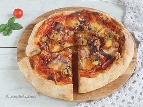 | Pizza tonno e cipolla con cipolla rossa di Tropea, un classico in Calabria, con tonno all'olio d'oliva, una pizza soffice ad alta digeribilità con g di lievito. |